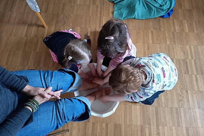 symbolische Fußwaschung: Kindergartenkinder wuschen