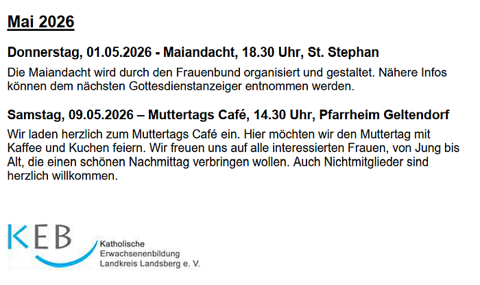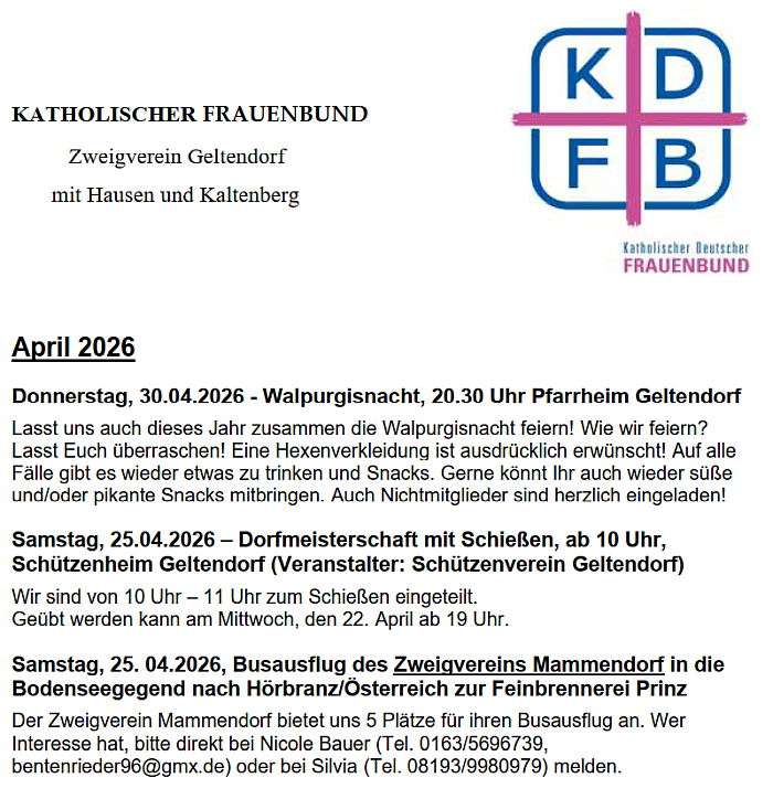 Termine und Veranstaltungen vom Frauenbund Geltendorf