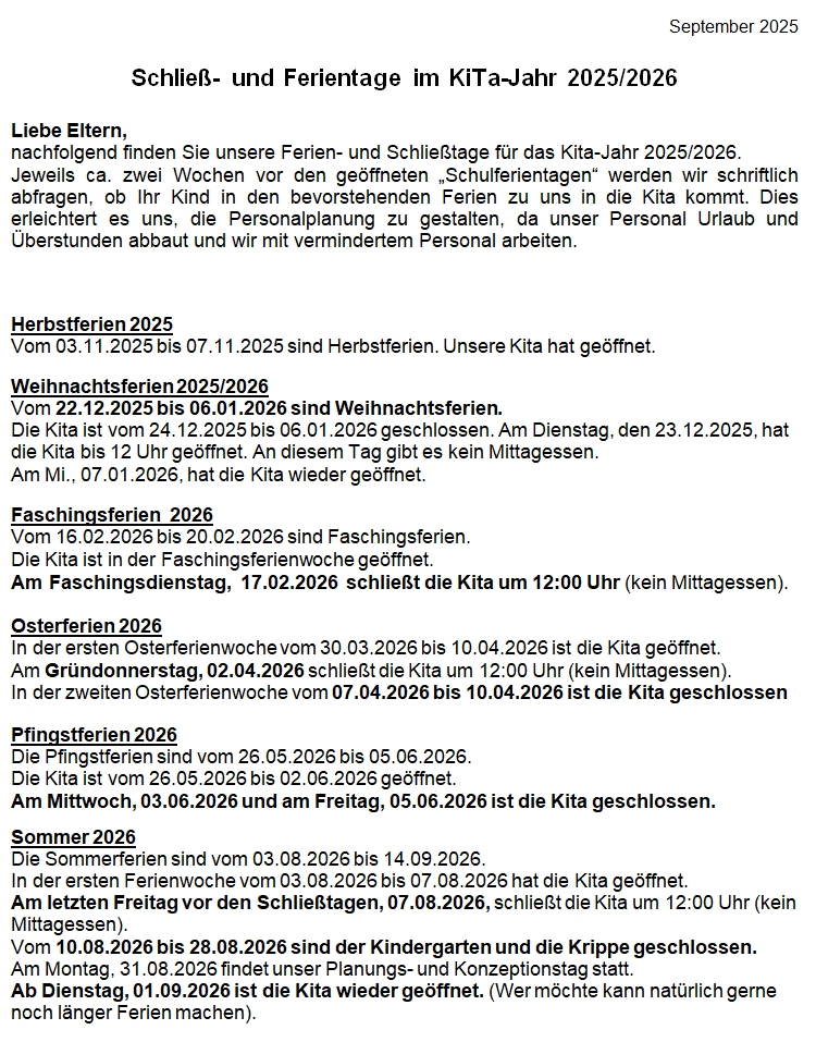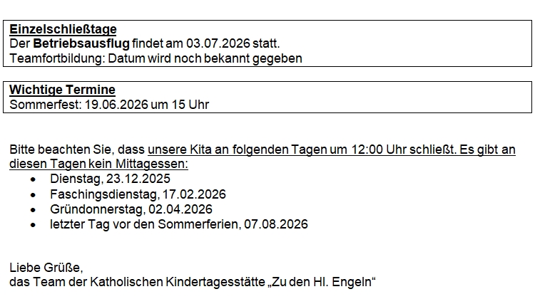 Terminübersicht Kindertagesstätte "Zu den Hl. Engeln"