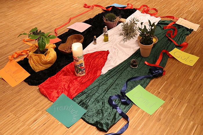Stuhlkreis um eine themenbezogene, mit den Landesfarben