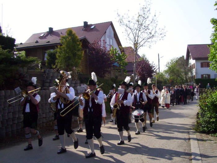 am Pfarrhof. Hier wurden sie von der Blaskapelle Walleshausen